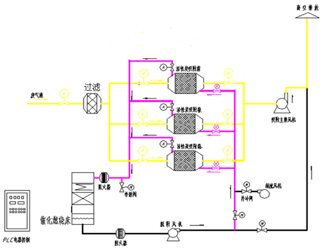 系統(tǒng)由3個(gè)活性炭吸附箱(2用1備),1個(gè)催化燃燒床構(gòu)成,將各條生產(chǎn)線中的所有排氣管合并連接引至凈化設(shè)備,各個(gè)支管上安裝一只手動(dòng)調(diào)節(jié)閥,配比調(diào)節(jié)風(fēng)量;在吸附凈化裝置與廢氣進(jìn)口之間安裝一套過濾預(yù)處理設(shè)備,處理粉塵,從而避免活性炭微孔被堵塞,然后送入活性炭吸附箱進(jìn)行吸附凈化,當(dāng)其中一活性炭吸附器接近飽和時(shí),系統(tǒng)將自動(dòng)切換到備用活性炭吸附箱(此時(shí)飽和活性炭吸附箱停止吸附操作),然后用熱氣流對(duì)飽和活性炭吸附箱進(jìn)行解吸脫附,將有機(jī)物從活性炭上脫附下來。在脫附過程中,有機(jī)廢氣已被濃縮,濃度后的濃度較原濃度提高幾十倍,達(dá)2000mg/m3以上,濃縮廢氣送到催化燃燒裝置,最后被分解成CO2與H2O排出。完成解吸脫附后,活性炭吸附器進(jìn)入待用狀態(tài),待其他活性炭吸附箱接近飽和時(shí),系統(tǒng)再自動(dòng)切換回來,同時(shí)對(duì)飽和活性炭吸附器進(jìn)行解吸脫附,如此循環(huán)工作。最后凈化后的潔凈氣體由主排風(fēng)機(jī)排入大氣中。