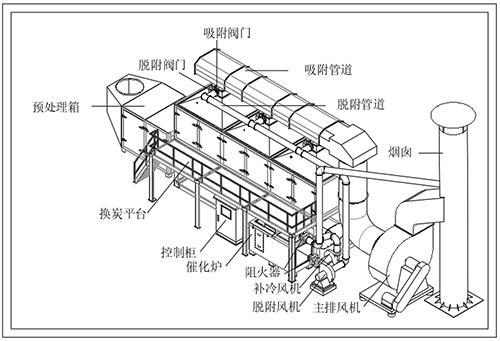 首先有機廢氣在風(fēng)機的作用下有機廢氣送入活性炭吸附箱進行吸附凈化,凈化后的潔凈氣體由主排風(fēng)機排入大氣中。吸附裝置配有備用吸附箱1套,當(dāng)活性炭吸附飽和后通過控制閥門切換至催化燃燒脫附狀態(tài);脫附再生系統(tǒng)采用在線脫附再生,即吸附過程為連續(xù)式處理工藝,在備用吸附裝置投入使用同時,飽和吸附箱則進行脫附工作,脫附后活性炭箱預(yù)備至下次循環(huán)使用。
